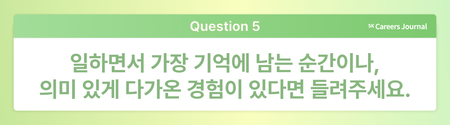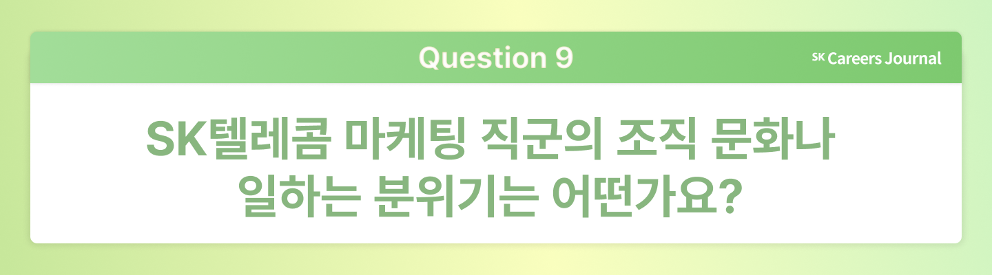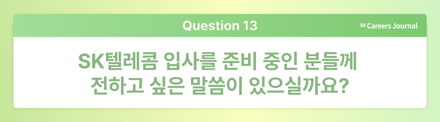 수한님: SK텔레콤에서는 빠르게 변화하는 시장 흐름 속에서 늘 새로운 과제를 마주하고, 이를 해결해 나가는 과정에서 역동적인 경험을 쌓을 수 있습니다. 무엇보다 나이와 경력에 상관없이 구성원의 의견을 존중하는 문화가 깊게 자리 잡고 있다는 점이 분명한 장점입니다. 자신만의 주관과 방향성을 가지고 주도적으로 일하고 싶은 분이라면, 도전해 보시기를 바랍니다.