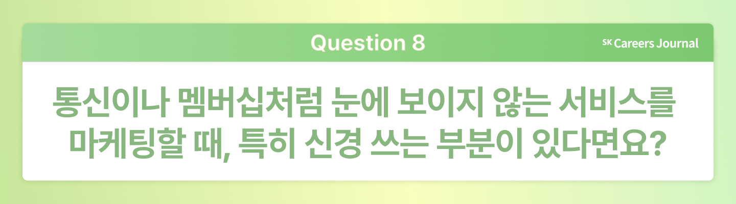 마케팅은 ‘설득의 기술’이 아니라, ‘이해의 기술’이라는 말이 있습니다. 이번 인터뷰를 통해, 고객의 시선에서 시작해 전략과 혜택을 설계하는 SK텔레콤 마케터들의 진짜 일상을 조금 더 가까이서 들여다볼 수 있었습니다.