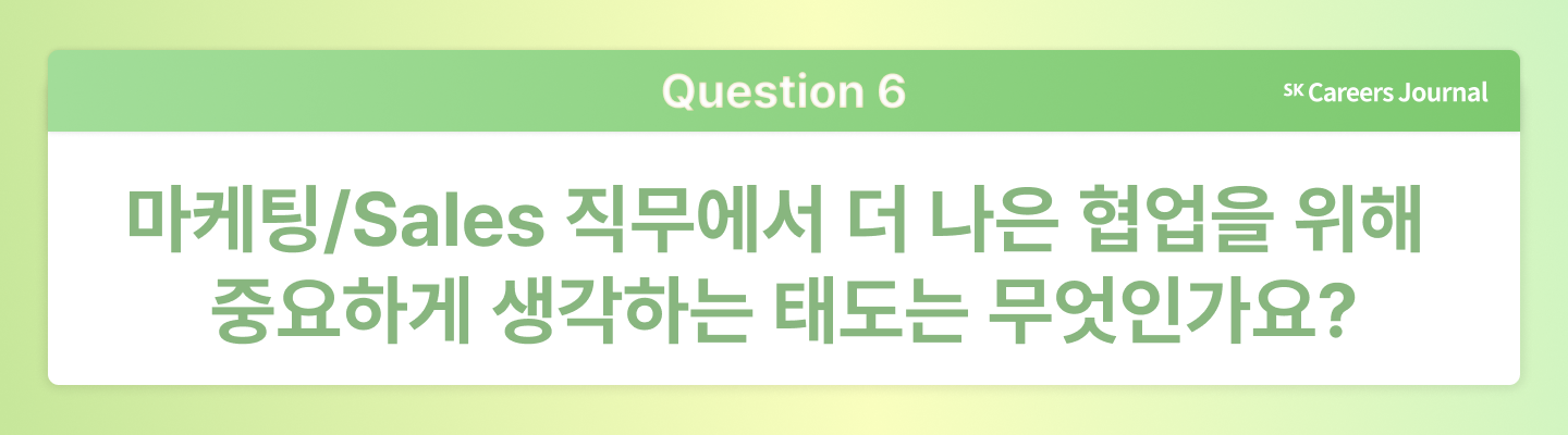 세모님:SK텔레콤의 마케팅 업무는, 제가 맡은 일이 가족과 친구를 포함한 많은 사람의 일상에 직접 영향을 미치고, 그 반응을 바로 체감할 수 있다는 점에서 정말 특별하고 의미 있다고 생각해요. 변화와 트렌드를 즐기고, 빠른 호흡의 업무를 좋아하는 분이라면 잘 맞을 거예요. 저는 ‘똑똑한 사람보다 꾸준히 준비한 사람이 이긴다’는 말을 믿는 편인데요. 여러분도 자신만의 속도로 차근차근 준비해 오셨다면, 분명 좋은 결과가 있을 거예요. 곧 함께 일할 수 있는 날이 오기를 기대합니다.