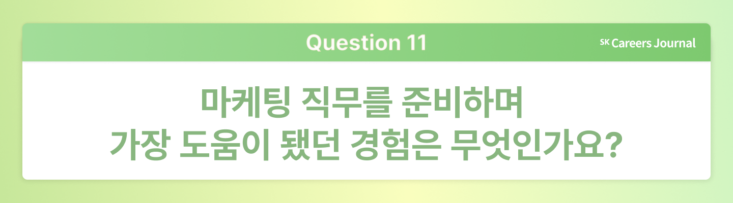 세모님:특정 활동 하나보다는, 다양한 경험을 해보는 것이 정말 중요하다고 생각해요. 여러 상황 속에서 내가 어떤 생각으로, 어떻게 대처해 나갔는지의 경험들이 나의 자산과 자신감이 되는 것 같아요. 이것이 현업에서 마케팅 업무를 할 때에도 순간순간의 판단이나 일 처리와 자연스럽게 연결되는 걸 느낍니다. 작고 사소한 경험이라도 쉽게 잊히지 않도록 평소에 기록해두는 습관을 추천하고 싶고, 배운 점이나 개선해야 할 점이 무엇인지도 함께 정리해 보면 더 좋겠습니다.