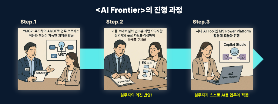 주 1회 full-day로 5주 간 진행되며, 앞 2주는 교육을, 뒤 3주는 본격적인 산출물 제작을 진행합니다. YMG가 주도하여 AI/DT로 업무 프로세스 적용과 혁신이 가능한 과제를 발굴하고, 이를 토대로 심화 인터뷰 기반 요구사항 정의서와 플로 차트를 작성하여 과제를 명확히 합니다. 이후 사내 AI Tool인 MS Power Platform(주로 Copilot Studio)을 활용해 업무 효율화를 진행합니다. 이 모든 작업의 핵심은 프로그램 실행 과정에서 실무자의 의견이 반영되며, 실무자가 직접 프로세스 고도화 작업에 참여한다는 점입니다.