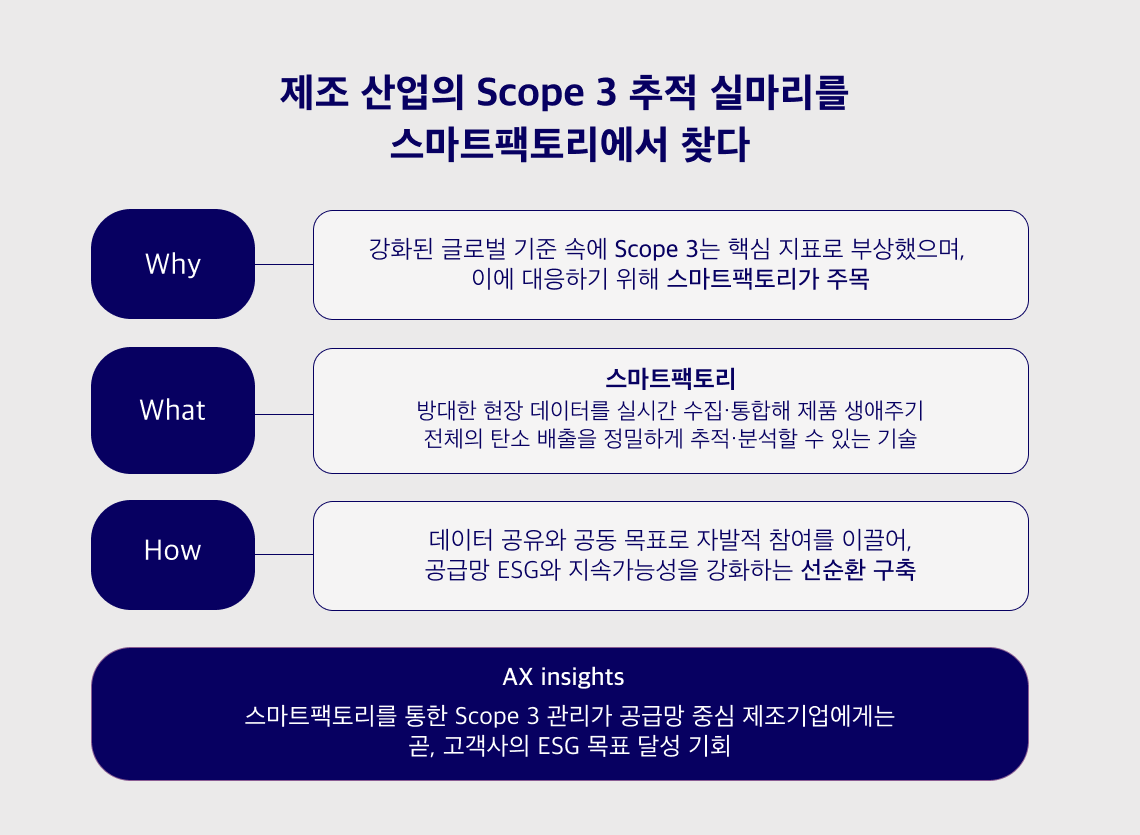 WHY: 관리 사각지대에서 핵심과제로: Scope3의 변화 제조 산업은 제품 전 생애주기에 걸친 탄소 발자국 관리가 필수 과제가 되었고, 특히 공급망 전반에서 발생하는 Scope 3 배출은 전체 비중이 크지만 기업이 직접 통제하기 어려워 오랫동안 ‘측정 불가능 영역’으로 남아 있었습니다.