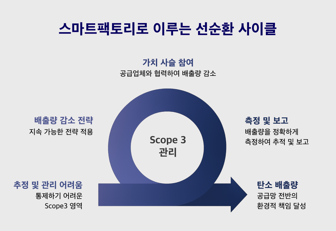 Scope 3는 이제 글로벌 신뢰·투자 유치·수출 경쟁력을 좌우하는 핵심 지표입니다. 대응을 미루는 것 자체가 가장 큰 리스크가 되는 시대에, 기업은 자사 뿐 아니라 공급망 전반의 배출 관리 체계를구축해야 합니다. 스마트 팩토리는 보이지 않던 배출을 가시화하고, 이를 데이터 기반 전략과 실행으로 전환할 수 있는 실질적인 해법입니다. 특히 글로벌 공급망의 중심에 있는 제조 기업에게는 Scope 3 관리 역량 자체가 고객사 ESG 목표 달성의 기회로 이어집니다.