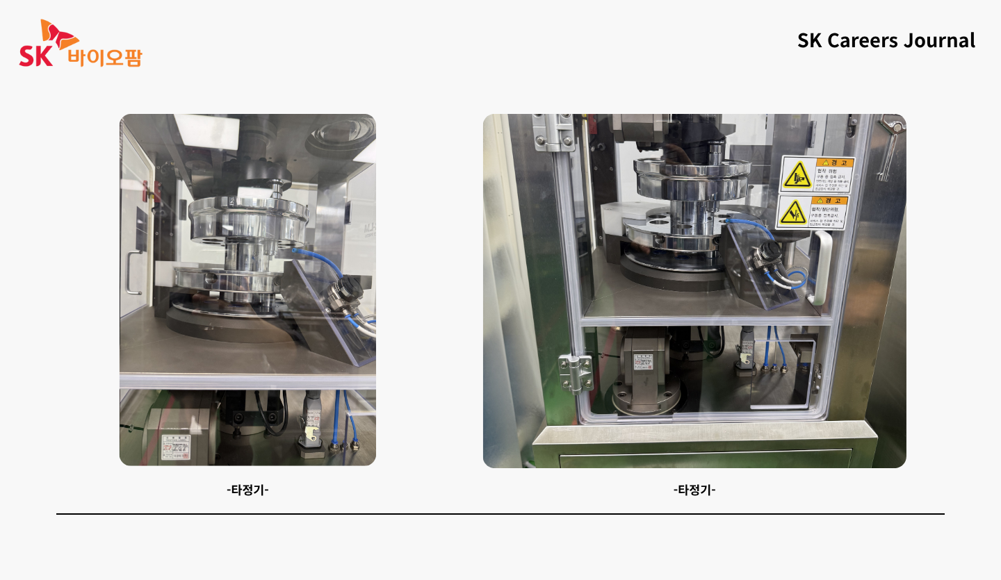 다음으로 보았던 것은 타정기입니다. 이 기계는 파우더 형태의 약을 우리가 흔히 보는 알약 형태로 만드는 기계였습니다. 알약이 하나씩 완성되는 섬세한 과정을 통해 연구원 분들의 수많은 노력이 보였습니다.