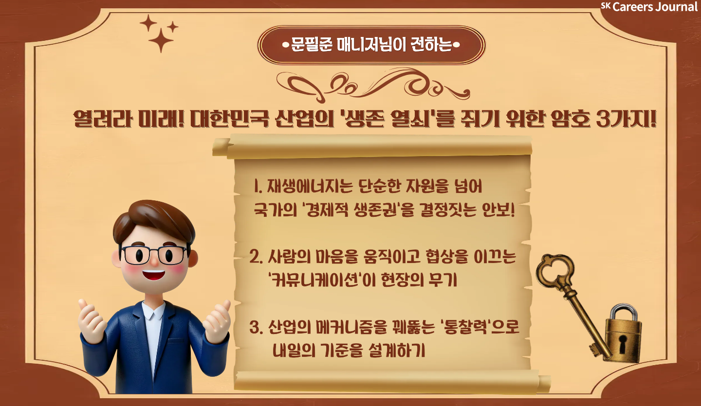 지금까지 SKI E&S 재생에너지개발1팀의 문필준 매니저님과 함께 이야기를 들어보았습니다. 오늘 인터뷰를 통해 재생에너지가 단순한 환경 보호를 넘어, 대한민국의 경제와 안보를 지키는 핵심 열쇠임을 확인할 수 있었습니다. ⚡️🔑