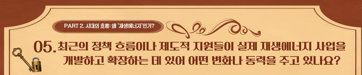 🎤문필준 매니저님: 재생에너지는 사실 지금 우리나라에서 두 번째 붐 정도 되는 기간인 것 같습니다. 2010년대 후반에서 2020년 전후로 1차 붐이 있었고, 그 이후에는 재생에너지에 대한 국민적인 공감대가 좀 부족하다 보니 전력 요금 인상 등에 대한 우려가 있었습니다. 하지만 지금은 그런 부분들이 많이 해소되어 새롭게 떠오르는 2차 붐 시기가 되는 것 같습니다. 외부에서 재생에너지를 하고 싶어 하는 사업자도 많고 국가적으로도 추진을 강력하게 하려고 하다 보니, 환경적으로는 그 어느 때보다도 사업 추진이 원활하게 이루어질 수 있는 매우 중요도가 높은 시기라고 생각합니다.