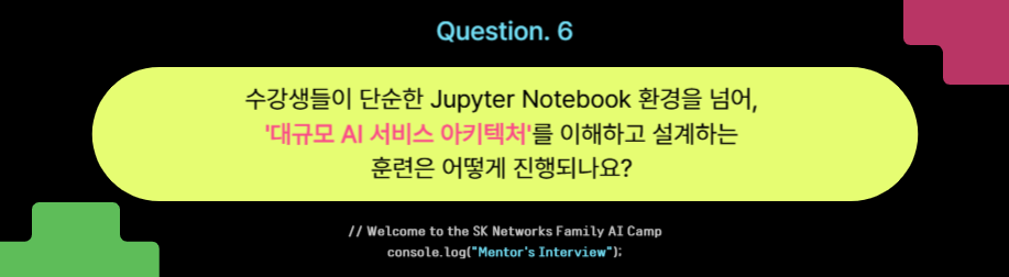 인터뷰를 진행하며 가장 인상 깊었던 점은 SK네트웍스 Family AI Camp가 실전 감각을 길러주는 커리큘럼 아래 진행되고 있다는 점이었습니다. 특히 학습하기 편한 주피터 환경에 안주하지 않고, 배우기 어렵더라도 현업에서 필수적인 능력을 위주로 가르친다는 점에서 수강생의 실력 향상을 최우선으로 여기는 강사님과 운영진분들의 진심을 느낄 수 있었습니다. 🤝