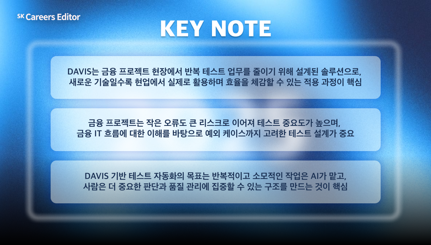 특히 김수정 매니저님은 DAVIS 기반 테스트 자동화 프로젝트를 현장에 성공적으로 안착시키며, 단순한 기술 도입을 넘어 실제 업무 방식의 변화를 이끌어낸 경험을 공유해주셨는데요. DAVIS에 대한 소개부터 금융 도메인에서 테스트 자동화가 갖는 의미, 새로운 솔루션을 현장에 적용하기까지의 고민과 판단 기준, 그리고 AI 시대 금융 IT 커리어를 고민하는 후배들에게 전하는 메시지까지 모두 담았습니다.